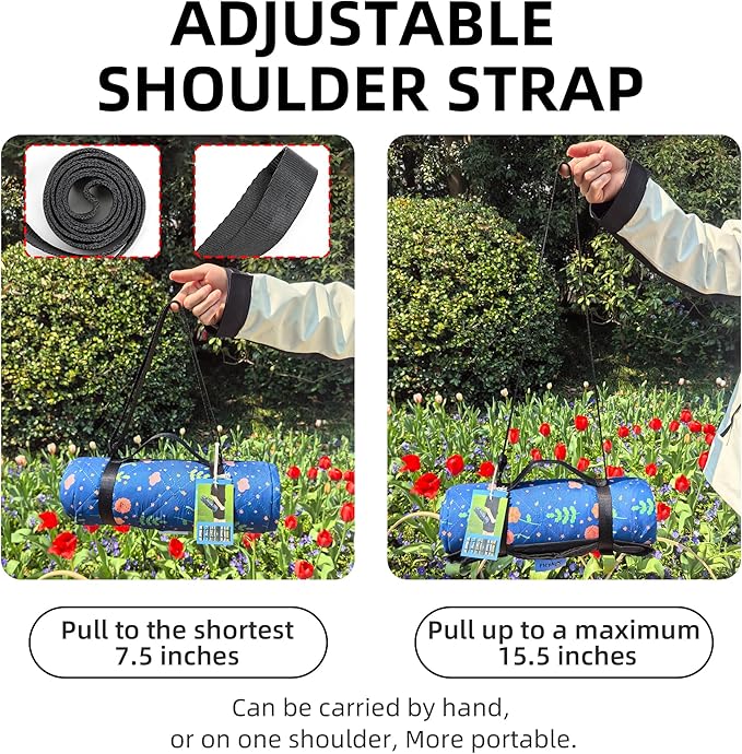 • Easy to Fold & Lightweight: picnic blanket can shrink down to a very portable size of 15''x 5''. With the help of the velcro, it will not loose easily and take too much space. The strap can be adjusted to different lengths to meet different carrying ways, you can carry it by hand, put on shoulders, which free up your hands when holding too much.The weight of the mat is only 1.8lbs, you can fold it with simple steps, carry or store it anywhere you want.