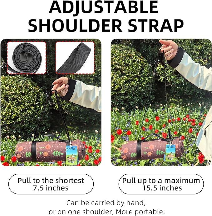 • Easy to Fold & Lightweight: picnic blanket can shrink down to a very portable size of 15''x 5''. With the help of the velcro, it will not loose easily and take too much space. The strap can be adjusted to different lengths to meet different carrying ways, you can carry it by hand, put on shoulders, which free up your hands when holding too much.The weight of the mat is only 1.8lbs, you can fold it with simple steps, carry or store it anywhere you want.