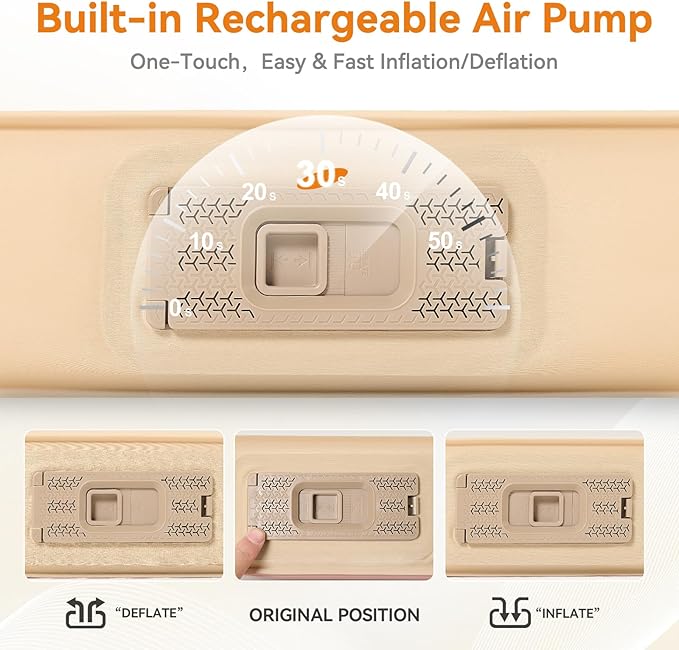 • 【BUILT-IN AIR PUMP, QUICKLY INFLATION& DEFLATION】 This sleeping pad features a built-in air pump design. Just slide the button for fast inflation/ deflation within 5min, completely free your hands. Provide you an unparalleled experience of relaxation. By allowing you to adjust the firmness to your preference, caters to your individual needs.