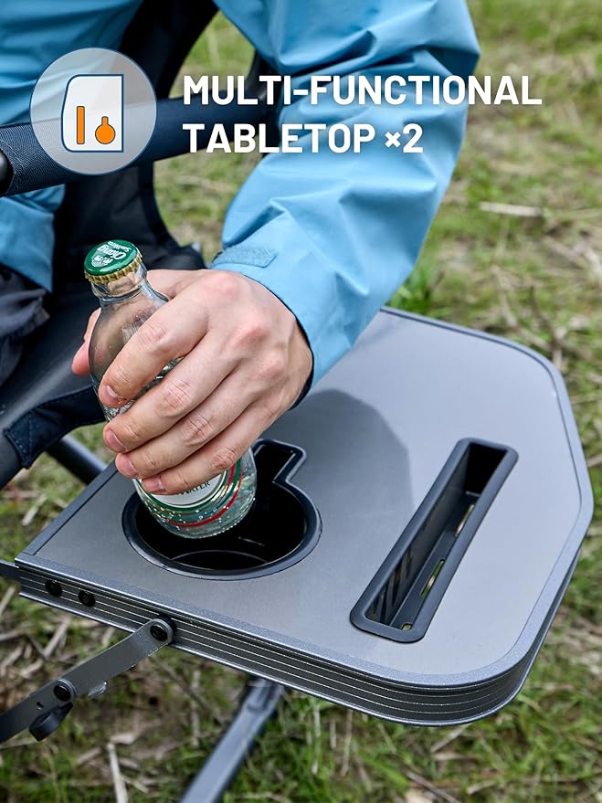 • HANDY STORAGE OPTIONS: You'll love the foldable dual side tables with dedicated cup holders and phone slots, plus 2 large mesh storage pockets on the back – perfect for stashing drinks, snacks, books, keys or other adventure must-haves