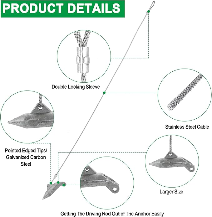 • 【Well-made and Durable】 Due to the relatively large 0.5inch diameter of the holes for the earth anchors, which fits most drive bar sizes on the market, so there will be no situation that the drive rod cannot be pulled out or taking the ground anchors out with it. Constructed with stainless steel cables and galvanized carbon steel anchors for durability, rust and corrosion resistance.