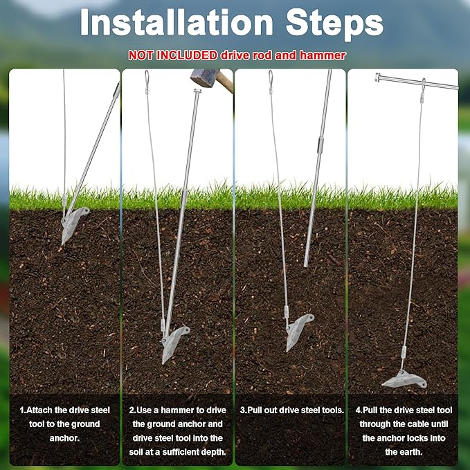 • 【Well-made and Durable】 Due to the relatively large 0.5inch diameter of the holes for the earth anchors, which fits most drive bar sizes on the market, so there will be no situation that the drive rod cannot be pulled out or taking the ground anchors out with it. Constructed with stainless steel cables and galvanized carbon steel anchors for durability, rust and corrosion resistance.