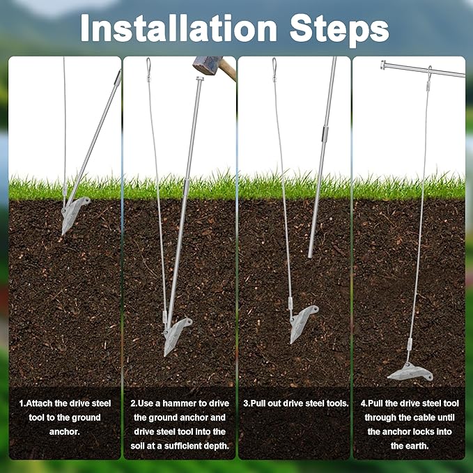 • 【Well-made and Durable】The matching drive bar fits well with the ground anchor, so there is no need to worry about getting stuck in the earth anchor and not being able to remove it, or taking out the ground anchor together. Constructed with stainless steel cables and galvanized carbon steel anchors for durability, rust and corrosion resistance.