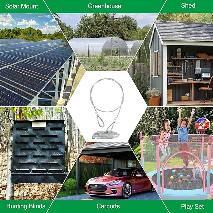 • 【Widely Application】 The universal design of the ground anchor allows it to be applied to a wide range of objects and soil types. Easy hook anchor can prevent the theft or unwanted movement of outdoor items, such as Fence, Greenhouse, Carports, Gazebo, Tent, Swing Set, Playset, Shed, trapping, Mobile Home.