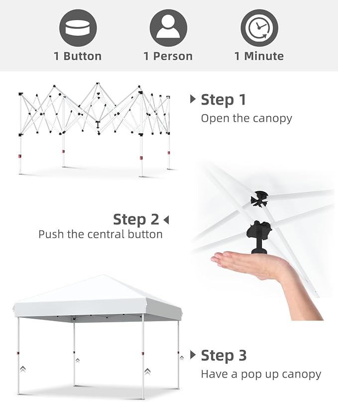 • EASY INSTALLATION: Designed with upgraded central lock system, simply press the central lock of the canopy tent to open or close it,and quickly complete the setup in a few seconds. no tools required.the canopy legs have 3 height adjustment holes to meet different occasions or needs.