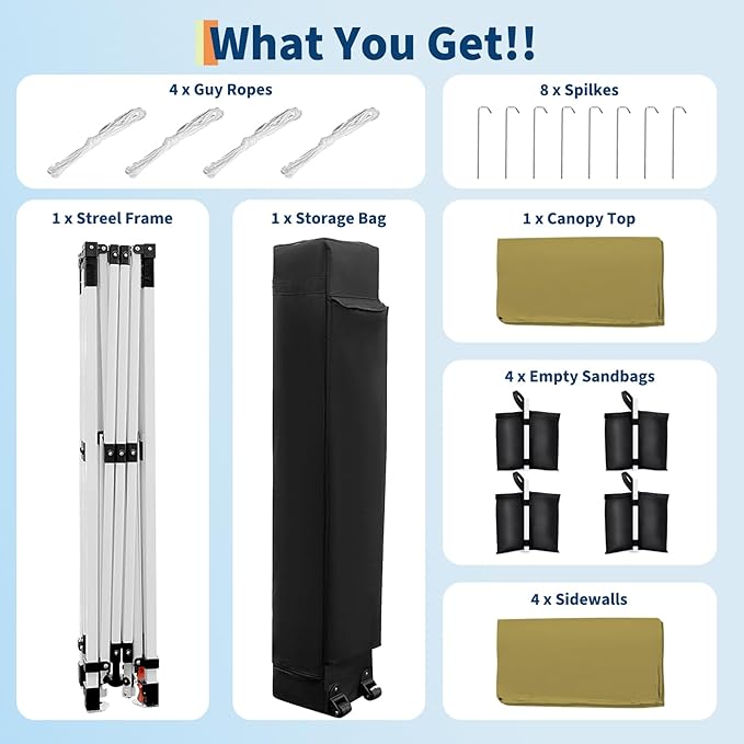 • WATERPROOF & SUN PROTECTION: Our pop up canopy is made of 210D Oxford fabric with a silver-coated canopy fabric providing UPF 50+ UV protection. The CPAI-84 flame-retardant fabric is waterproof, ensuring long-lasting durability.