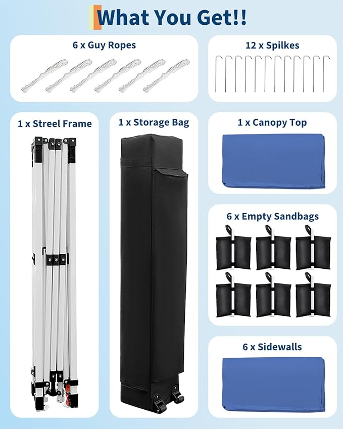 • VERSATILE USE: Our commercial pop-up canopy is suitable for picnics, camping, barbecues, sports, fishing, and other outdoor activities. It can also be used in yards, decks, farms, farmers' markets, beaches, and so on.