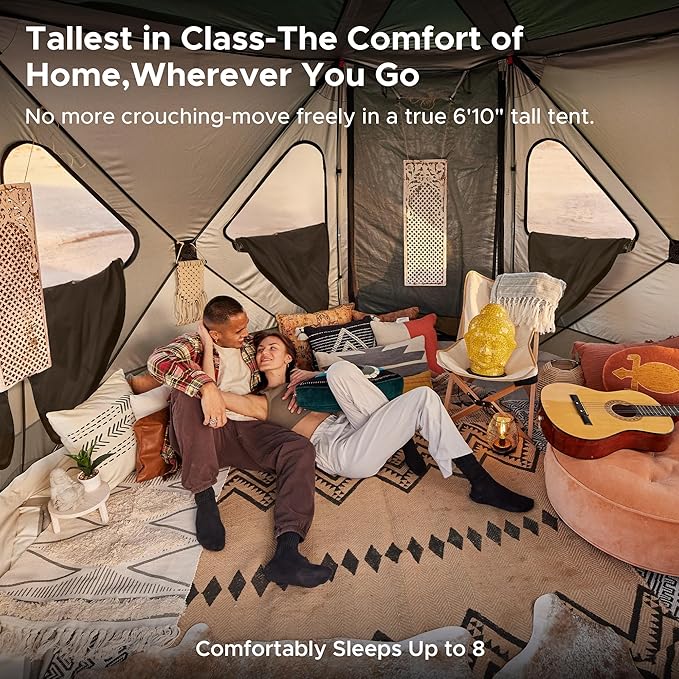 • SPACIOUS INTERIOR FOR ULTIMATE COMFORT: With a generous interior that comfortably fits 4-8 people, this tents for camping is perfect for family getaways or group camping trips. Measuring 6'10" tall, it provides ample space to rest and easily store all your gear and luggage. Its roomy design ensures a comfortable camping experience wherever you go