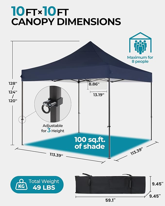 10x10 Pop Up Canopy with Wheeled Bag, Commercial Portable Canopy Tent, Easy Set Up, 4 Stakes & 4Sandbags & 4 Ropes, Waterproof Outdoor Shelter for Market, Parties, Navy Blue