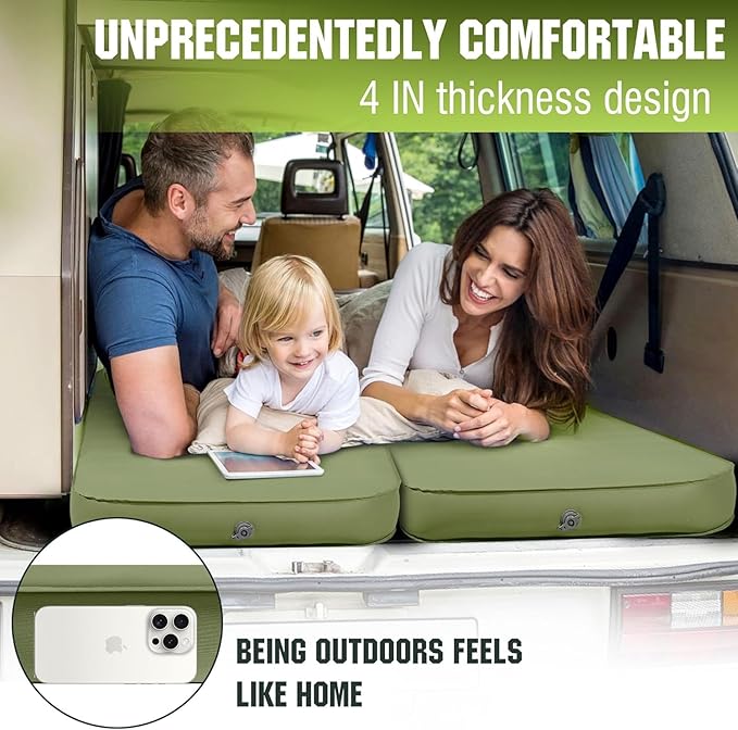 • Silent Sleep, No Disruptions: Our camping sleeping pad features a premium stretch-knit fabric surface that delivers whisper-soft comfort and minimizes noise. Unlike other air mattresses that squeak with every move, our design ensures you can roll, shift, or turn without disturbing your partner or tent mates. Perfect for light sleepers, families, or anyone who values true peace during outdoor adventures. Whether you're in a tent, a car, or hosting overnight guests, you'll experience deep, silent sleep like never before