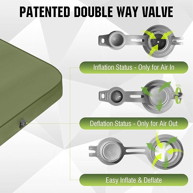 • Easy to Inflate & Deflate: Our self-inflating truck bed mattress comes with the unique double two way valve and makes inflating & deflating a breeze.Just several minutes for it to self inflate and a few bags of air added with the included pump sack, saving your time and effort. Reverse the valve cover and install it to the valve and the valve will stop air from getting back to ensure an easier deflation