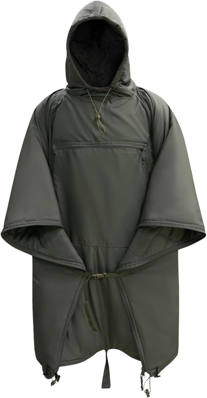 • Windproof Design: The camping insulation poncho with containable warm hood, collar windproof tightening rope and side fixed latch and hem windproof tightening rope eliminate cold air gaps, front zippered pocket (fits phones/keys) with hanging loop for quick access.