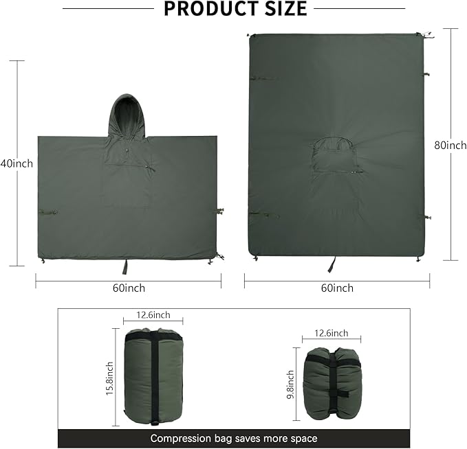 • Package: The multipurpose insulation poncho is integral self-pack pocket and be fully compressed into its compression sack for easy carry and storage in camping, backpack, car emergency kit, or hiking gear, reduces space and volume.