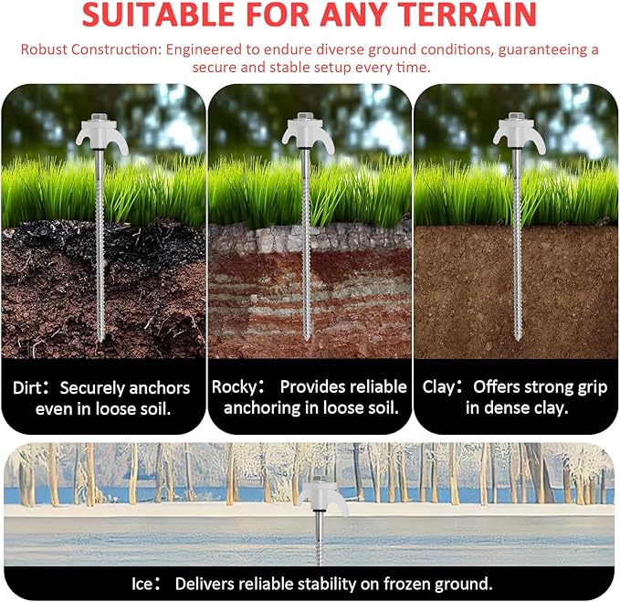 • 【Efficient and Convenient】By using a cordless drill or impact driver, the tent stakes can be quickly screwed into the ground, saving setup time. They are suitable for securing various outdoor equipment such as tents, canopies, sunshades, and guy lines. The spiral design provides stronger grip, making them ideal for grass, hard soil, gravel, and other surfaces.