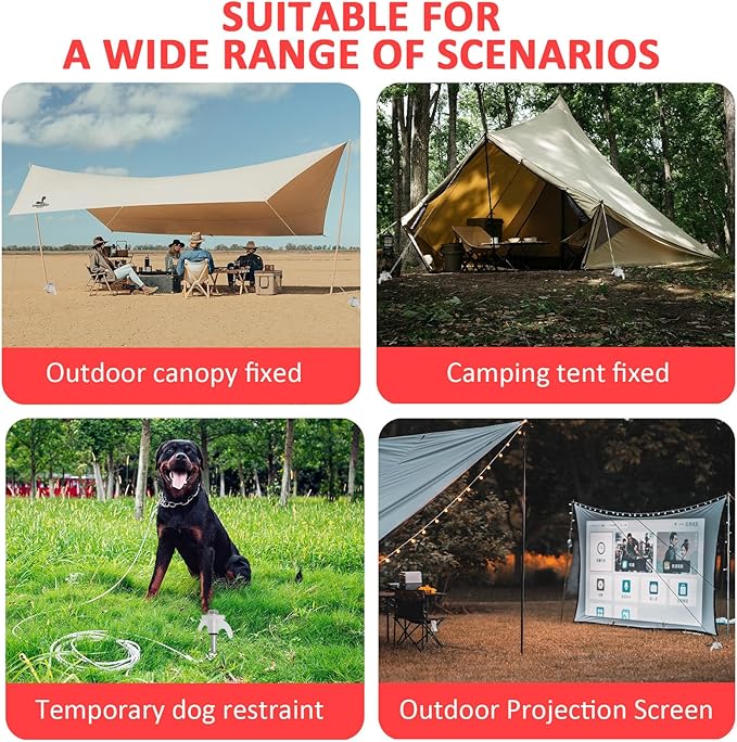 • 【Versatile Applications】These stakes are not only suitable for camping equipment like tents, canopies, and sunshades but can also be used to secure dog leashes, Christmas decorations, garden decorations, and more. They perform exceptionally well in windy conditions, making them perfect for outdoor travel, patios, gardens, and other occasions.