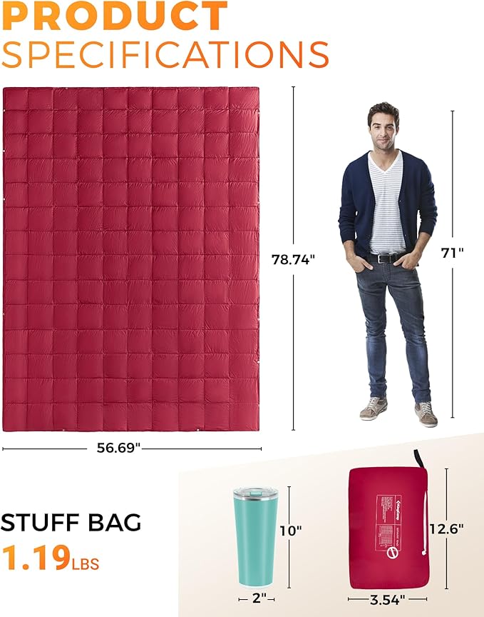 • COZY WARM LOFT FILL WITH DURABLE 20D NYLON SHELL FOR ALL-WEATHER WARMTH: Filled with 400g of hypoallergenic King Loft fiberfill, this camping blanket provides warmth and softness similar to natural down, without allergens or animal materials. The tightly woven 20D nylon shell is water-resistant and windproof, and helps trap body heat and block cold air—enhancing insulation to keep you warm and comfortable at campsites, beaches or mountain cabins.