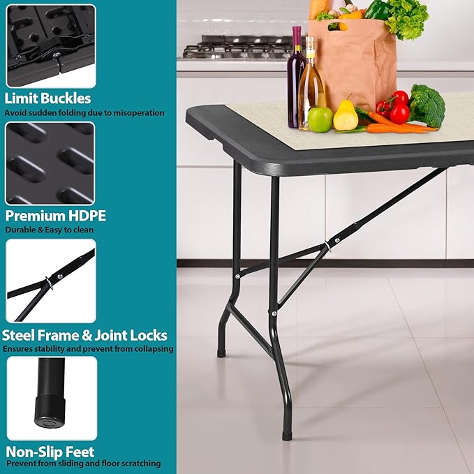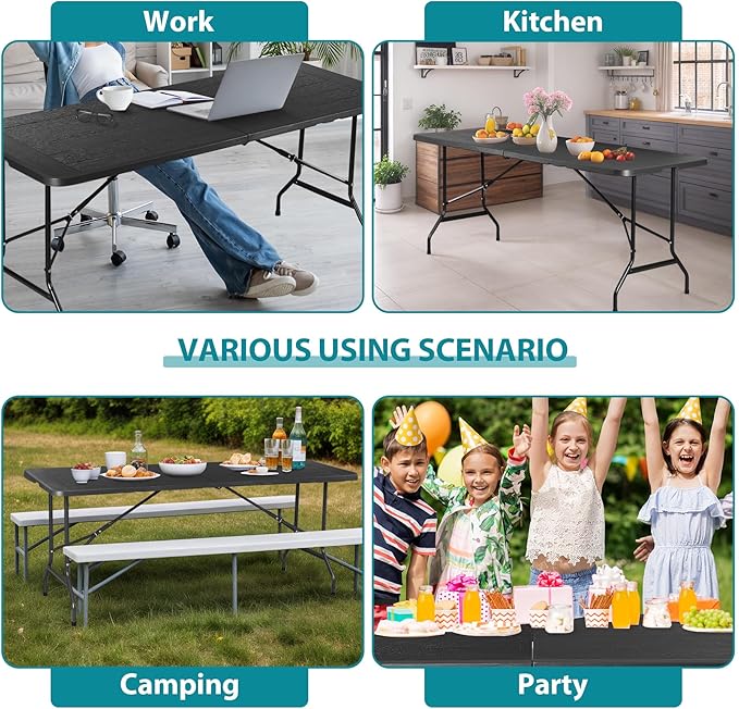 SUPER DEAL 6FT Folding Table for Indoor Outdoor, Portable Heavy Duty Fold-in-Half Plastic Dining Picnic Party Camping Table with Carrying Handle, Black