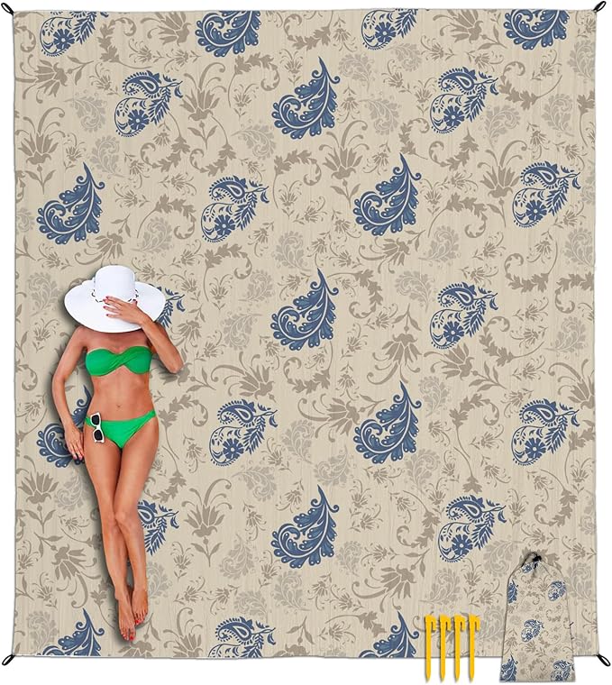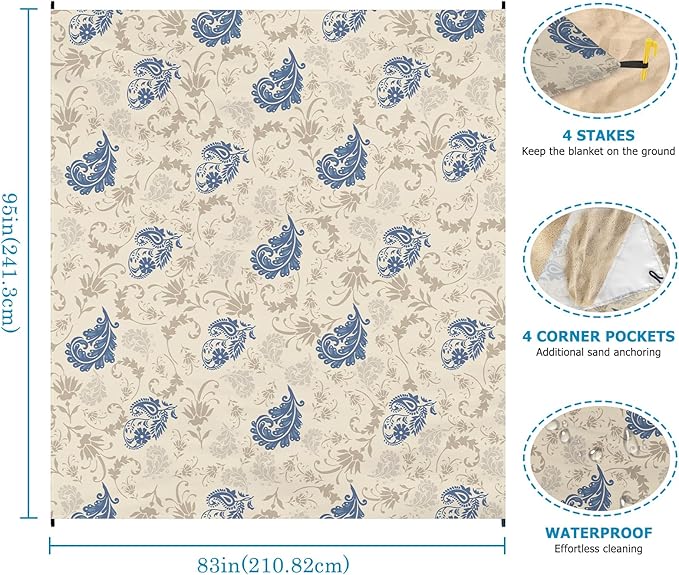 • Beach Accessories: This beach blanket set includes 1 beach mat, 4 stakes and 1 storage bag. Each corner of the blanket has a pocket where you can put sand and hold the blanket to the ground with stakes, effectively preventing it from shaking