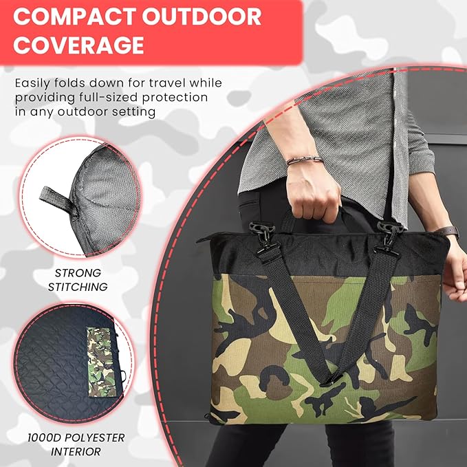 Outdoor Packable Camo Blanket - 1000D Polyester Interior & RIPSTOP Fabric Exterior Blanket with Adjustable & Removable Carrying Strap - Front, Back Storage Pocket - Ideal for Camping & Outdoor Use