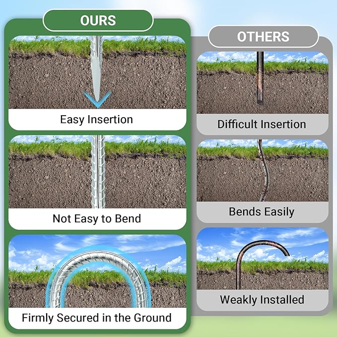 • Versatile Outdoor Use: These ground stakes are ideal for various outdoor activities, including gardening, camping, and yard work. Whether used as heavy-duty trampoline stakes, swing ground stakes, soccer goal stakes, chain-link fence stakes, or for securing camping tents, they provide reliable support.