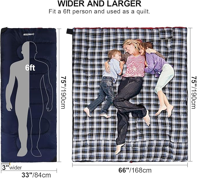 • Ample Space: Size is 75"x33"/190cm x 84cm. REDCAMP sleeping bag for adults of 6 feet in tall. Package size: 17"x8"x8"/45x20x20cm. Pack weight: 4lbs/1.8kg.