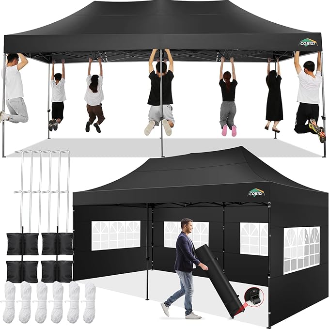COBIZI 10x20 Pop up Canopy Tent 10x20 Canopy with 6 Sidewalls Waterproof Heavy Duty Commercial Canopy Tent for Parties Outdoor Tent Garden Gazebo Tent, Carry Bag with Wheel(10x20ft, Black)