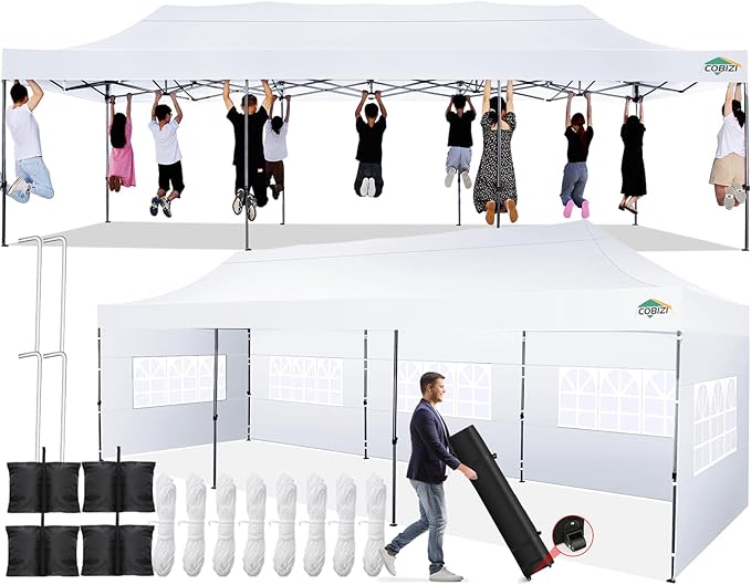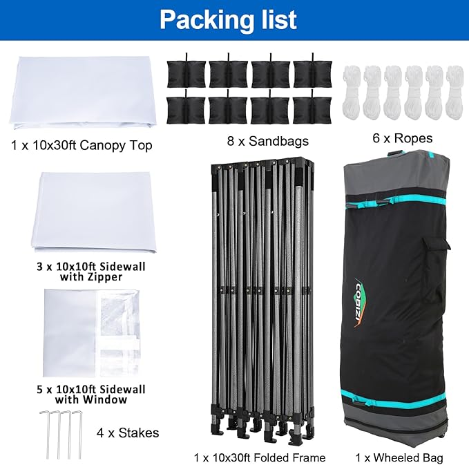 • 【Packing List & After-sale Protection】Pop up canopy 10x30 tent Top Cover x 1, Pop Up Canopy Frame x 1, Sidewall with Zipper x 3, Sidewall with Window x 5, Sandbag x 4, Ground Nails x 4, Ropes x 8, Wheeled Storage Bag x 1. We have a professional service team and provide 24/7 customer service to help you with any questions or queries you may have while using COBIZI products. One year after-sale protection for the canopy frame; Six months after-sale protection for fabrics and accessories.