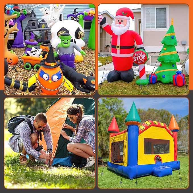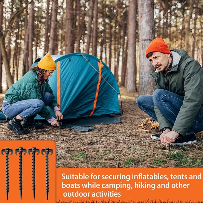 • Easy to Use: These tent stakes heavy duty have a long, pointed head and a spiral shape, which can be easily screwed into hard, dry soil and sand. Just insert plastic stakes into the soil, adjust screw in tent stakes to the angle you need, tie one end of the rope to the pile, and then tie the other end of the rope to the inflatables, which is very convenient to use
