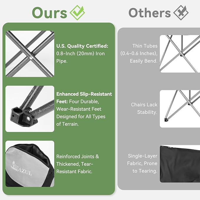 • 【Quick Fold & Comfortable to Carry】 Folds in seconds, weighs just 10 lbs, and measures only 39 × 7 inches when packed. Our upgraded storage bag features reinforced stitching and a wide, padded shoulder strap — built to go wherever you do. Camping chairs lightweight