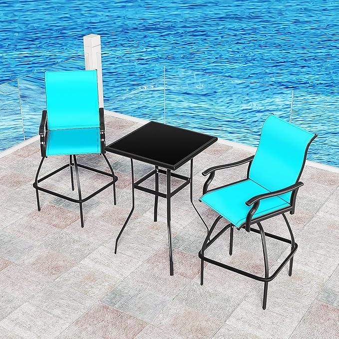 LEVELEVE Patio Bar Set 2pcs Swivel Bar Stools Outdoor Bistro Textilene Furniture Stability All-Weather Set (3, Lake Blue Padded)