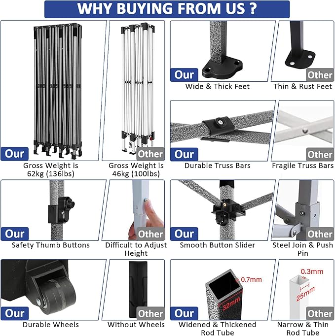 • 【3 Height Settings】10x30 pop up party tent straight leg has 3 height settings. Thumb latch lock system easy to lock and release, raise the pop up tent to a desired height. Canopy tent 10x30 straight leg height options: 220cm/86.6inch, 230cm/90.5inch, 240cm/94.5inch. Corresponding party tent center height options: 305cm/120inch, 315cm/124inch, 325cm/128inch. 10x30 canopy perfect for commercial activities, camping, festivals, tailgating, backyard events and etc..