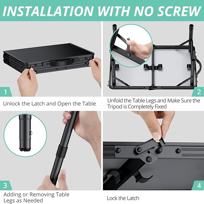 • DURABLE & STABLE CONSTRUCTION: Built with a high-quality aluminum alloy frame and a dense MDF desktop, this table is both sturdy and durable. The U-shaped frame and buckle design enhance stability, supporting up to 66 lbs, ensuring safety during use.