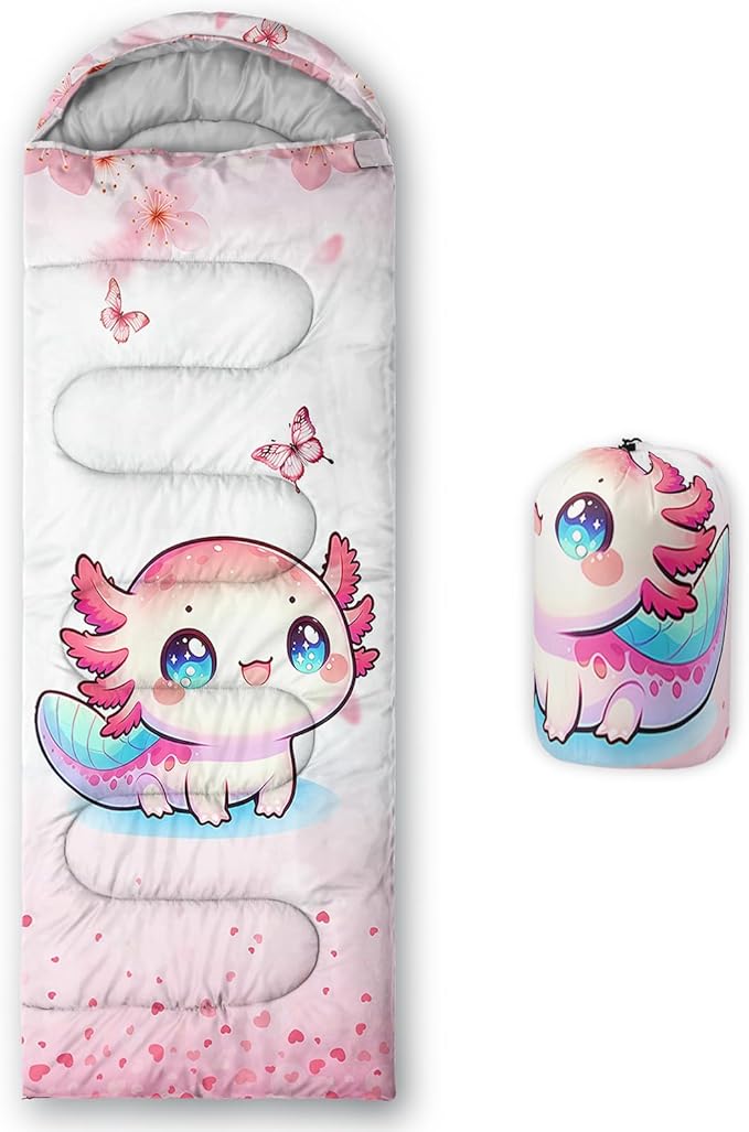 • 【Design】This sleeping bag features a kawaii axolotl pattern with pink flowers and butterflies,and the vibrant design adds fun to your outdoor journey.The zipper and waterproof fabric design keep you warm even on wet nights,so you can have a great night!