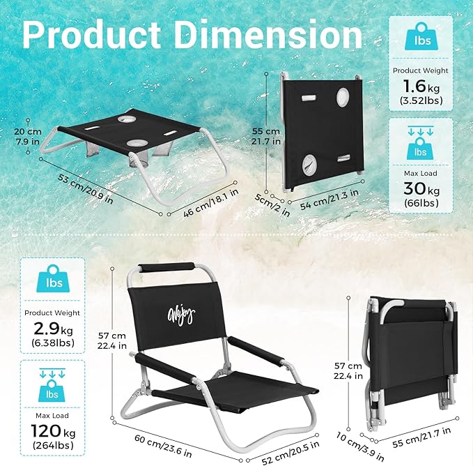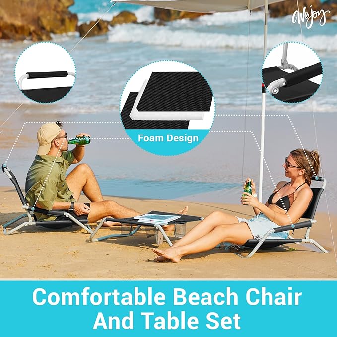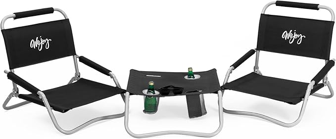 • 【Comfort Redefined】Indulge in pure comfort with the WEJOY beach chairs and table sets.The folding beach chairs feature soft foam neck and armrests,providing extra support for your neck, back, and arms.The low-seat design allows you to relax your body and unwind fully.Whether you're lounging on the beach or having a picnic,this set ensures a cosy experience,making every outdoor moment truly enjoyable.