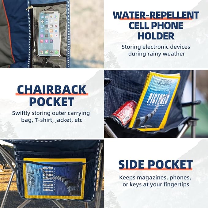 • 【3-in-1 Smart Storage System】Camping chair with organizer and drink holder, equipped with touch-sensitive waterproof phone pouch (works through case), instant-access side pocket, and oversized back storage compartment. Built-in cooler maintains 3 cans chilled for 6hrs with cup holder