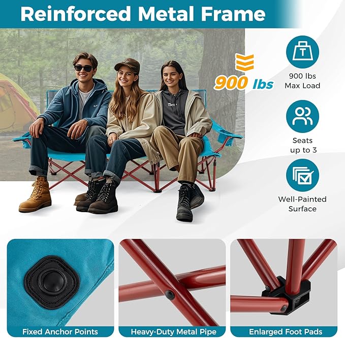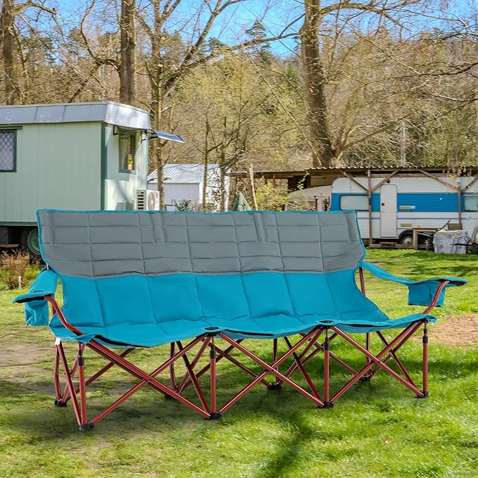 • Oversized Padded Seat: With 62" x 19" seat dimension, this camping chair seats up to 3. The chair also features a comfortable padded seat consisting of premium 600*300D Oxford cloth and soft sponge, ensuring a cozy yet long-lasting seating experience.