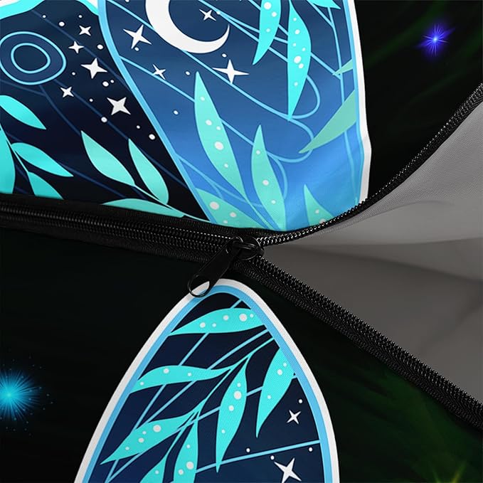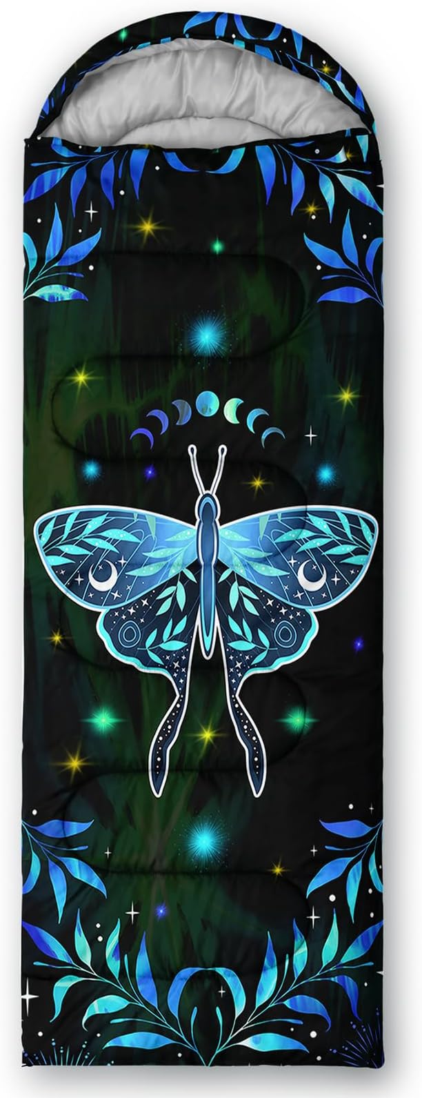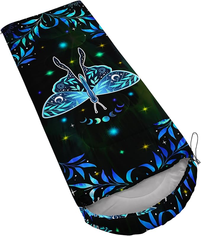 • Unique Moth Design:This Moth pattern sleeping bag is made of 3D digital printing with vibrant colors and patterns,size: 31W x 90L inches,temperature range: 32℉-77℉ (0℃-25℃),it also also have a weather resistant waterproof design to keep you warm and prevent you from any dampness,can be used in 3 seasons