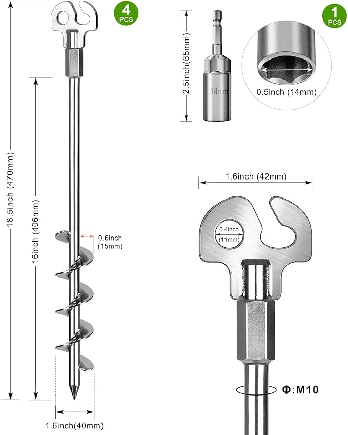 • 【Complete Set】Includes four 18” long ground anchors, a drill nut attachment, a storage bag, and a cleaning brush for a complete anchoring solution.