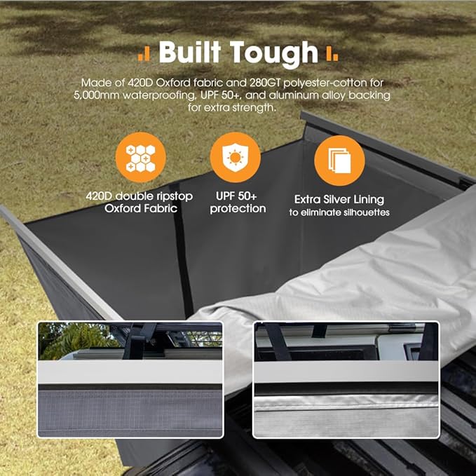 • Built for Tough Conditions: We built it with tough 420D Oxford fabric and 280GT polyester-cotton, so it’s not only durable but also waterproof with a 5,000mm rating. Plus, our shower tent offers UPF 50+ sun protection, and the aluminum alloy backing adds extra strength to make sure it holds up. And when you’re done, just fold it up and store it in the UV-resistant, waterproof 1,680D Oxford fabric travel cover.