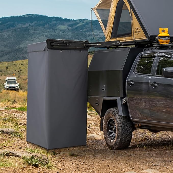 • 90° Swing Arm: Swing out the 90° arm, and you've got full access to your vehicle’s doors, canopy and gear—no more awkward squeezing around. If you’re looking for a little more privacy, the optional roof on the San Hima shower tent awning gives you just that. And when you’re ready for fresh air or a view of the night sky, simply roll the roof back to let in breeze or stargaze.