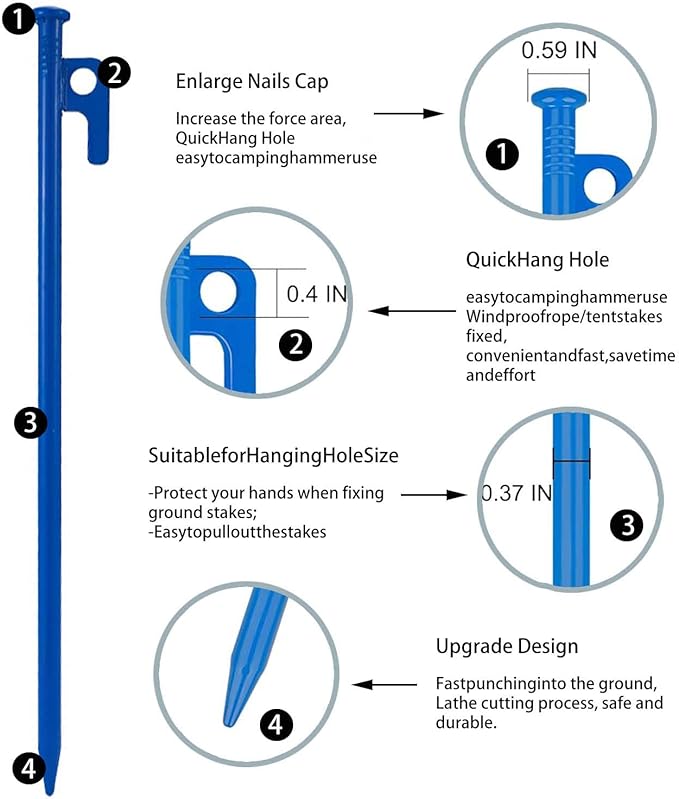 • 【Smart Design】 Featuring a large flat head and sharp tip, these stakes are easy to hammer into hard soil and remove effortlessly. The 12-inch length ensures maximum stability for your tent.