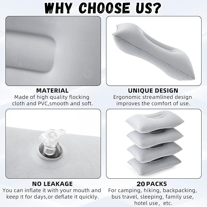 Geelin 20 Pack Inflatable Pillows for Camping Travel Beach Vacation Sand Squared Flocked Soft Fabric Backpacking Ultralight Pillows for Office Gray Sleeping Neck Head Lumbar Support