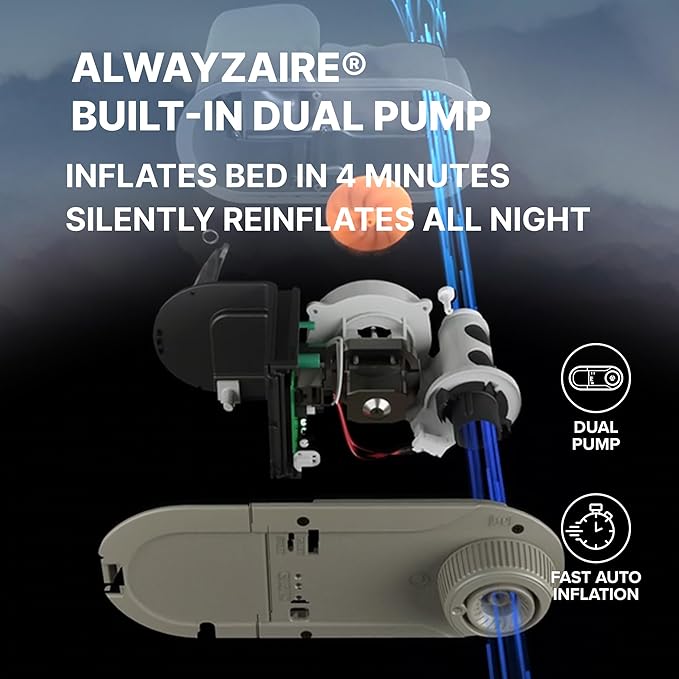 • STAYS INFLATED ALL NIGHT LONG: The advanced AlwayzAire built-in pump inflates the airbed in 4 minutes and automatically adjusts air pressure, silently reinflating as needed to maintain the desired firmness without any manual effort; Features USB-A & USB-C ports to charge devices while you sleep, so you (and your devices!) wake up refreshed and recharged