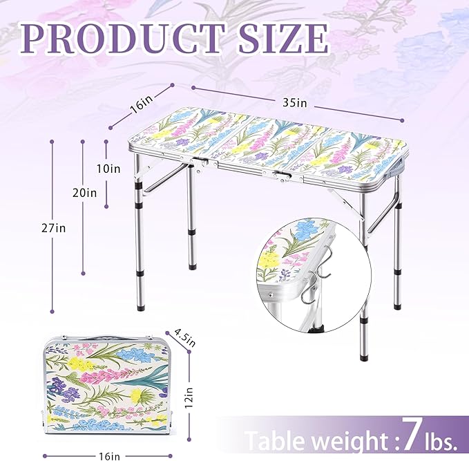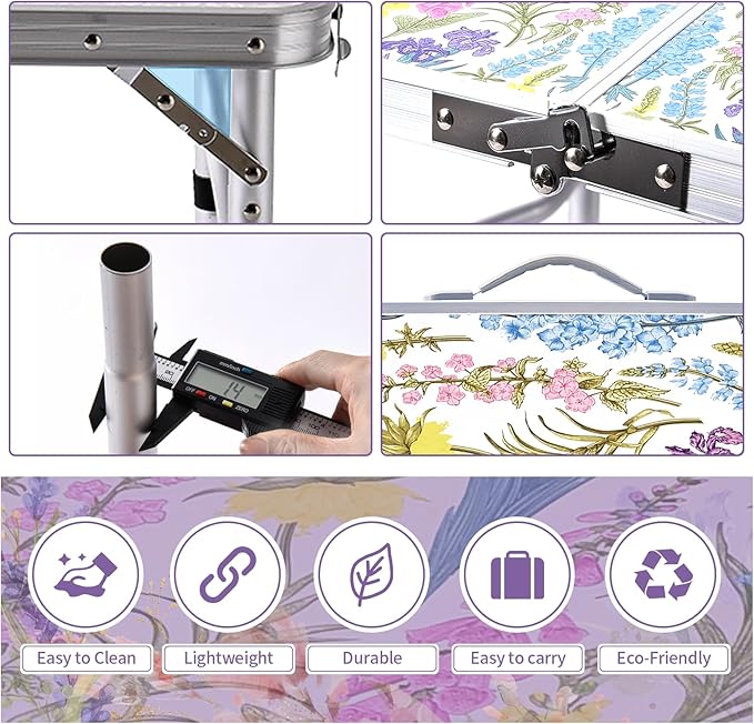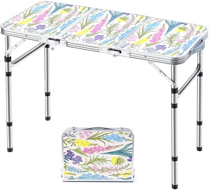 Folding Camping Table 3ft Portable Pinic Table Adjustable Height Small Card Table Aluminum Foldable Lightweight with Carry Handle for Outdoor Indoor Hiking Camp BBQ Beach (Blooming Floral)