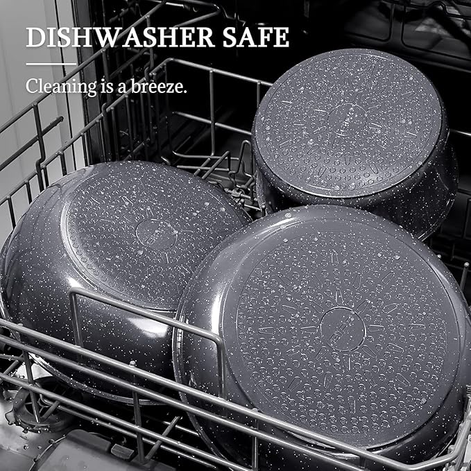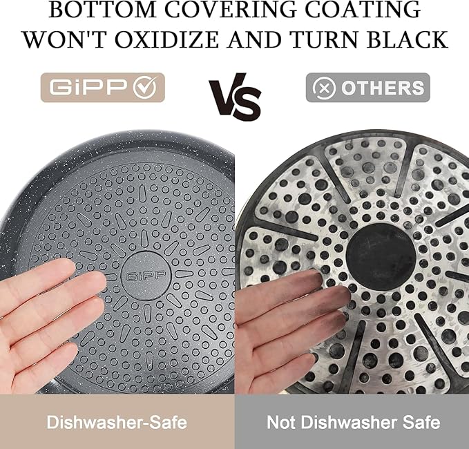 • Effortless Cleanup - GiPP Ceramic cookware set boasts an innovative dual-sided ceramic finish, inside and out, make cleanup easy without the hassle of stuck-on food. Dishwasher safe
