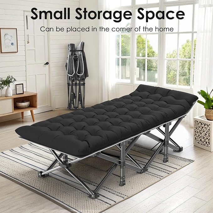 • 【Built-in Pillow Design】The headboard of our cot is a slanted design with built-in pillows, no need for extra pillows. The slight incline is ergonomically designed to ensure no more back, neck or shoulder pain in sleep! The mattress is also soft and thicker, so this is a very comfortable folding camping cot