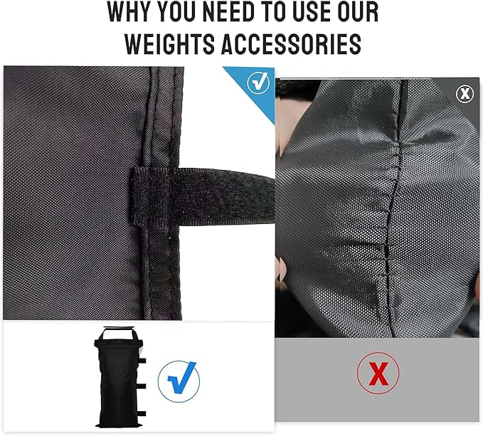 • 【EASY TO FILL & REUSE】 The canopy tent weights feature sturdy built-in handles, making them easy to carry, fill, and install. Simply fill with sand, rocks, gravel and bottled water, then attach to your canopy legs for quick setup and takedown. They can be reused for future events.