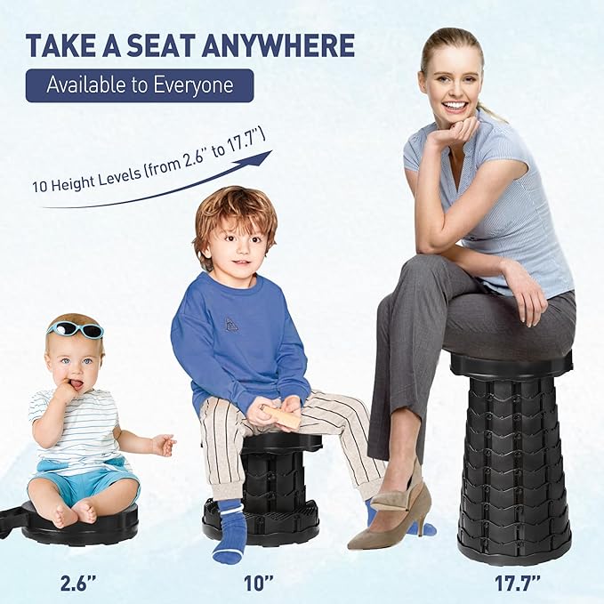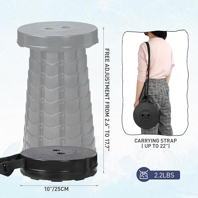 • 【Lightweight And Portable】This portable collapsible telescoping stool is only 2.2lbs, with a diameter of 10”, and can be folded into 2.6” in height, which is easy to carry and store. The adjustable shoulder strap makes it easy to carry or hang over the shoulder. You can also fold the collapsible stool up and hang it on your backpack with a clasp or put it in your bag. No matter where you go, you can sit anytime, anywhere.