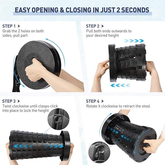 • 【Fish Scale Structure】The collapsible stool is made of high-density thickened PP material, resistant to cracks, UV rays, and weather extremes. Upgraded fish scale structure and reinforced 10-layer buckle design, increase collapsible stool strength, rigidity and stability. The anti-slip bottom ensures more stability, that can hold up to 400lbs.
