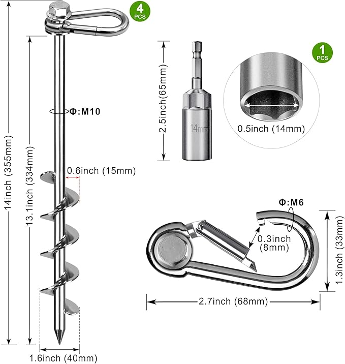 • 【Complete Set】Includes four 14” long ground anchors, a drill nut attachment, a storage bag, and a cleaning brush for a complete anchoring solution.